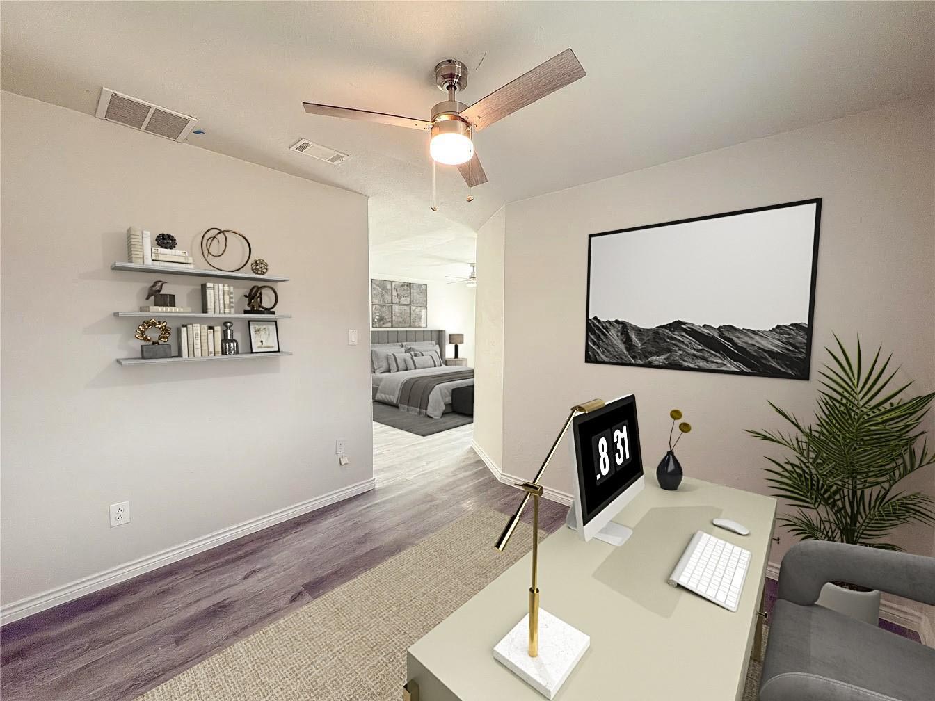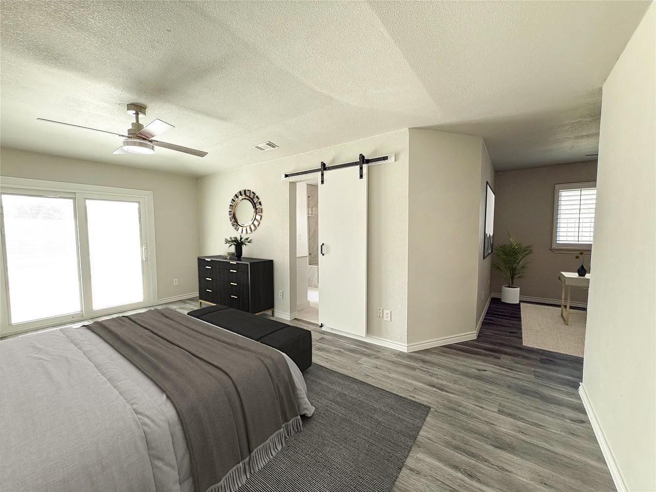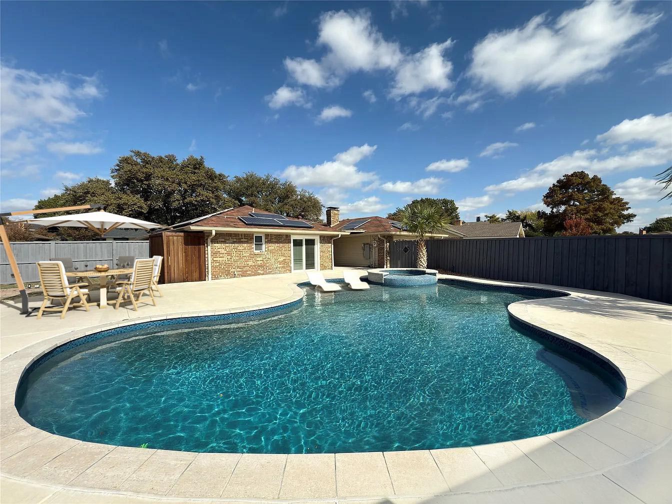 Welcome to 1912 E Branch Hollow, a beautifully updated Carrollton gem set on a spacious corner lot with an incredible backyard oasis. Enjoy your own private retreat featuring a sparkling pool with attached spa, tanning ledge, and lush palm trees, all perfectly complemented by a covered patio ideal for outdoor dining and entertaining! Inside, the home shines with a completely updated interior featuring quartz countertops, new cabinets, new windows, two stunning full bathrooms, and abundant closet space throughout. The serene primary suite looks out to the beautiful pool and offers a flexible sitting area—perfect for a nursery, home office, or cozy reading nook. Energy efficiency meets modern comfort with owned solar panels, providing long-term savings and sustainability. This move-in-ready home blends style, function, and resort-style living—an exceptional find in a prime Carrollton location.